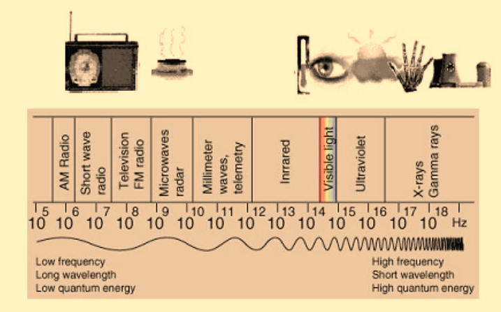 전자기파 스펙트럼은 주파수의 범위나 파장의 길이로 정의되며, 저주파 인 라디오파(RF)에서 부터 고주파인 우주선까지 해당됩니다.