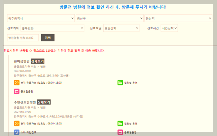 - 진료과목별, 진료 요일별 검색이 가능하며 병원명, 진료시간으로도 검색이 가능합니다.