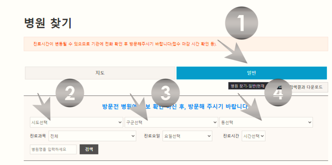 응급의료포털사이트를 이용하여 진료 과목별, 진료 시간별 병원 찾기