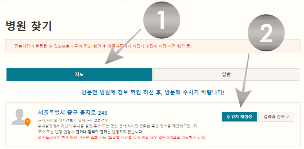 병원 찾기에서 현재 자신의 위치를 기반으로 병원을 찾을 수 있습니다.