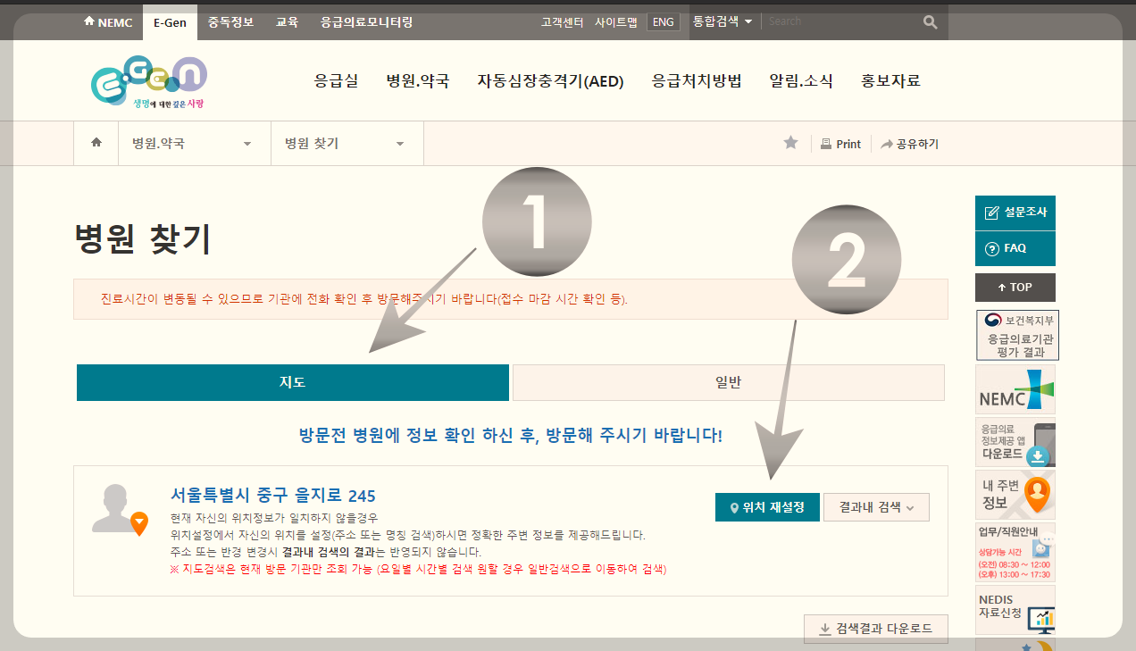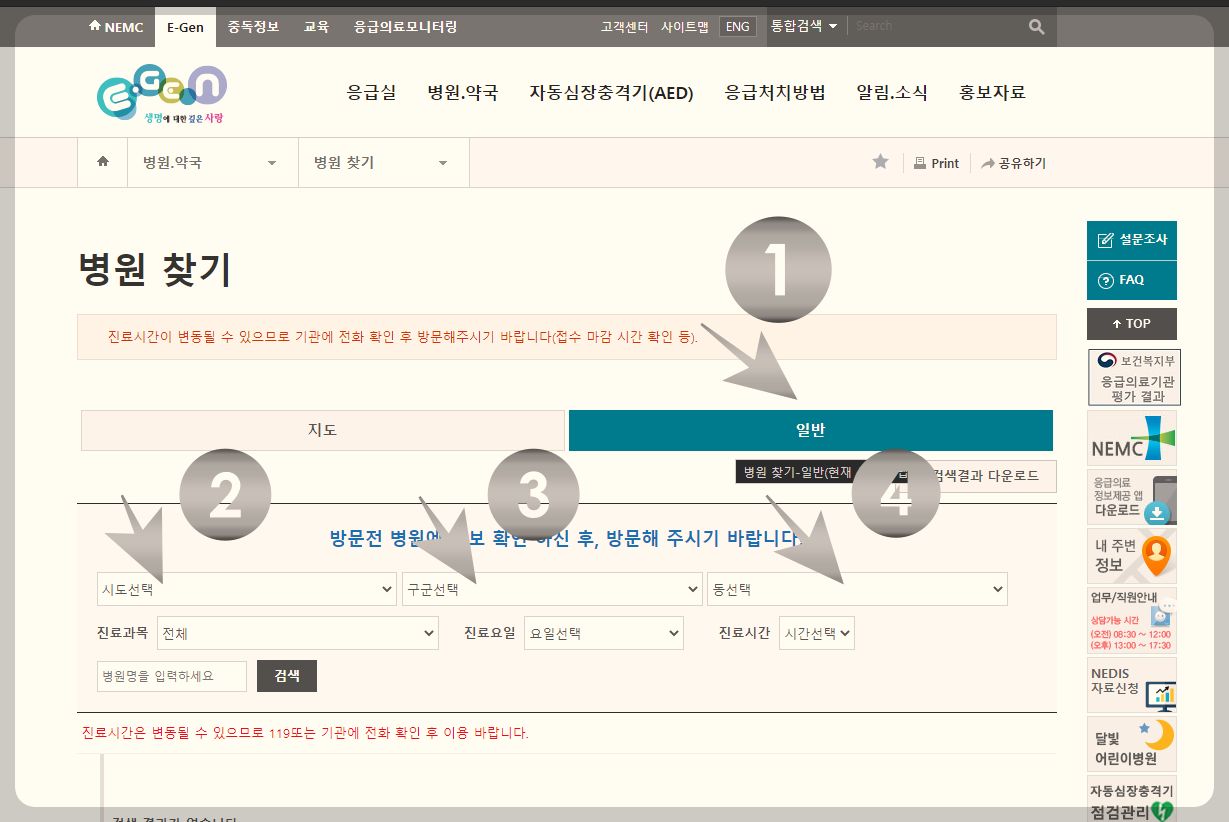 1) 응급의료포털사이트 > 병원, 약국 > 병원 찾기