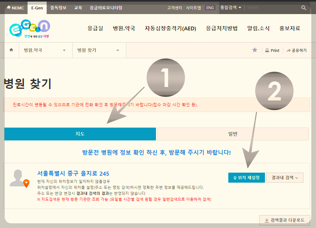 2) 병원 찾기 > 지도 > 위치 재설정