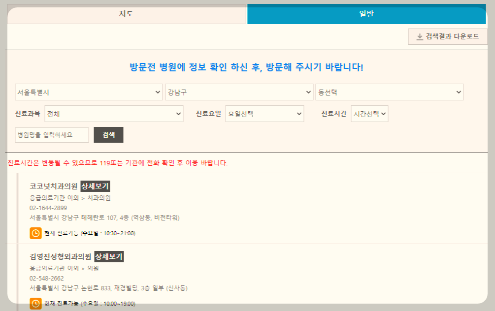 진료과목별, 진료시간별, 진료 요일별 병원 검색이 가능하니 편리하게 검색하시면 됩니다.