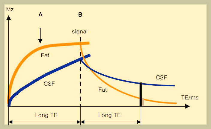 위 그림은 T2- weighted image의 Digram으로 T1-weighted image를 위해서는 TR을 두 조직의 T1성분차이가 많은 A지점에 주었고, T2 강조 영상은 TR을 T1성분이 되도록 없는 상태에서 이루어져야 하기 때문에 두조직이 거의 다 회복되는 지점인 B지점에서 TR을 선택해야 한다.