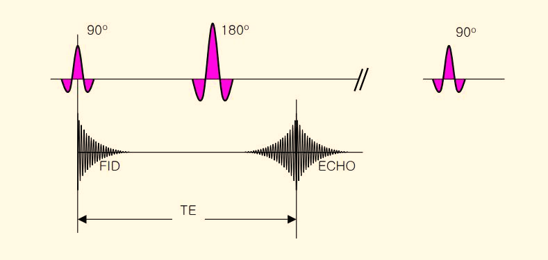 위 그림은 TE를 나타낸 Diagram으로 여기 Pulse인 90도 RF pulse와 Refocusing 180도 RF pulse를 사용 후 Echo 가 생성되는데 여기 pulse 부터 echo pulse 까지 총 걸린 시간을 TE 라고 합니다.