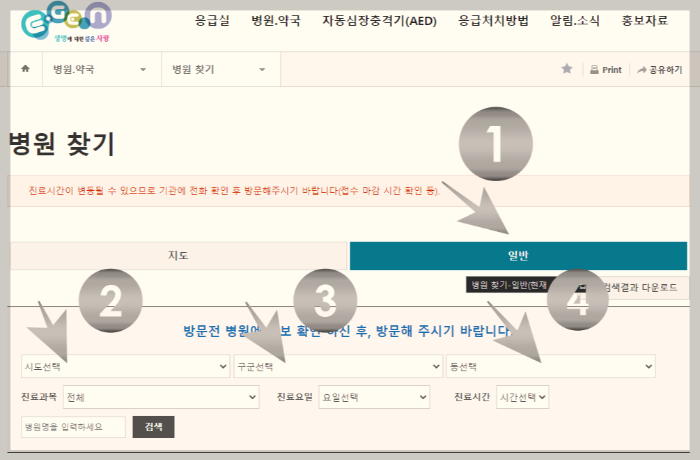 - 병원 찾기 > 일반을 클릭합니다.