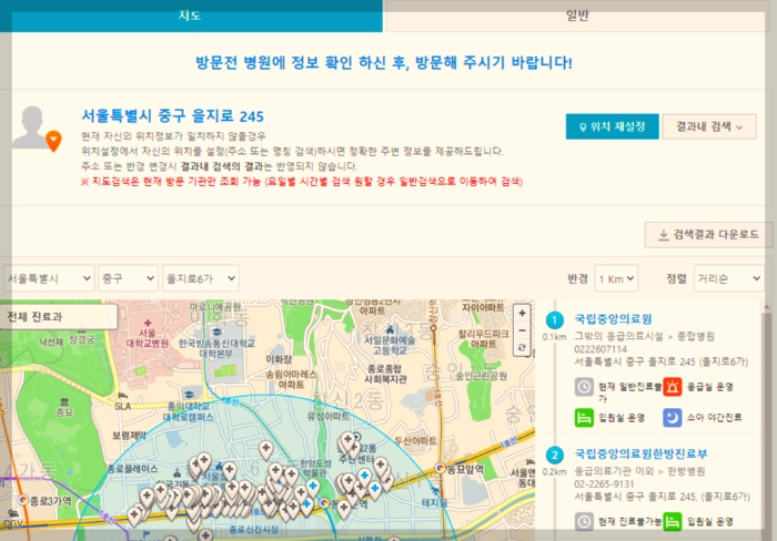 - 검색 결과는 아래 사진처럼 내 위치를 기준으로 이용 가능한 의료기관이 검색됩니다.