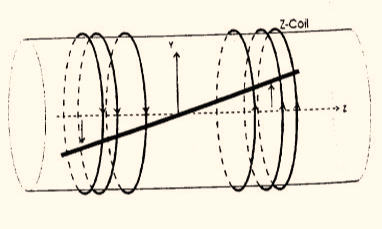 Z축 경사자장 코일에 일정시간 동안 전류를 흘리면, 경사자장 코일이 만드는 자장과 같은 극성의 주자장 방향은 자장의 세기가 더욱 커지고, 주자장과 반대극성을 만드는 경사자장 코일쪽의 세기는 감소하여 자석 중심으로 위치에 따라 자장의 세기가 경사진 모양으로 만들어 진다.