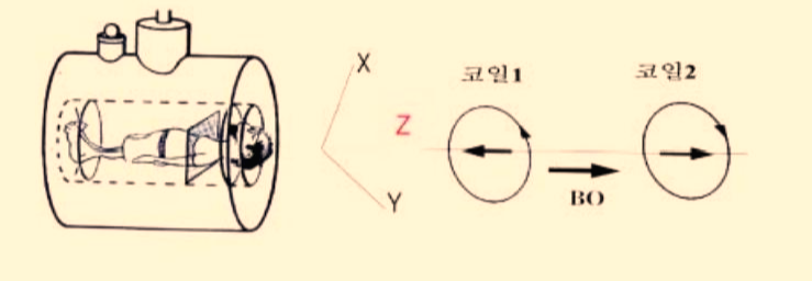 만약 그림 1-3과 같이 반대극성을 가진 직류 전류가 두 coil을 통해서 양 쪽의 반대 극으로 흐르면 Z축을 따라서 매우 조그마한 변화가 자기장에 생기게 된다.